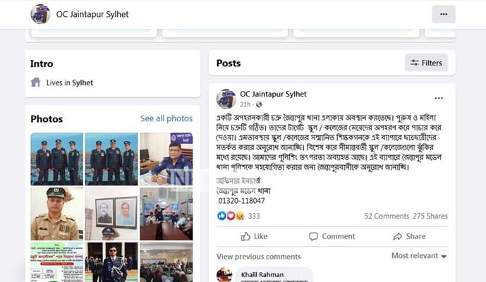 ‘ওসি জৈন্তাপুর সিলেট’ নামের ফেসবুক আইডি থেকে মঙ্গলবার ওই পোস্ট দেয়া হয়েছে।