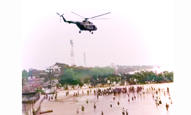 সুনামগঞ্জের তাহিরপুর উপজেলা সদরে বানভাসি মানুষের জন্য সোমবার দুপুর ১২টায় শেখ রাসেল মিনি স্টেডিয়ামে এয়ারফোর্সের হেলিকপ্টার থেকে ছুড়ে ফেলা হচ্ছিল ত্রাণসামগ্রী। অসহায়, বুভুক্ষু মানুষগুলো সেগুলোই দুই হাতে গ্রহণ করার জন্য ছুটে গিয়েছিলেন।