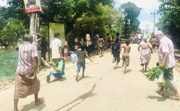 শুক্রবার (২৪ জুন)দুপুর ১২টার দিকে একটি সামাজিক সংগঠনের উদ্যোগে পিকআপ ভ্যানে করে ত্রাণ শহরের দিকে যাওয়ার সময় শিশু, নারী-পুরুষসহ বিভিন্ন বয়সী দুর্গত লোকজনের ওই গাড়ির পেছনে দৌড়াতে দেখা যায়।