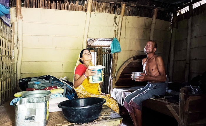 কৃষক নৃপেন্দ্রনাথের ঘরের চালে অজস্র ছিদ্র। বৃষ্টি হলেই ছিদ্র দিয়ে পানি পড়ে ঘরে। সেই পানি আটকাতে থালা বাসন নিয়ে এভাবে বসে থাকেন নৃপেন্দ্রনাথ ও তার স্ত্