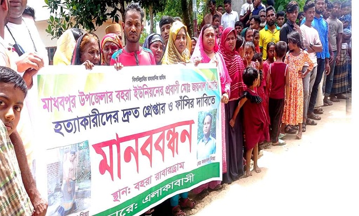 হবিগঞ্জের মাধবপুর উপজেলার বহরা ইউনিয়নের বহরা গ্রামের প্রবাসী জয়নাল মিয়ার হত্যাকারীদের দ্রুত গ্রেপ্তার দাবিতে মানববন্ধন ও প্রতিবাদ সভা করেছে এলাকাবাসী।