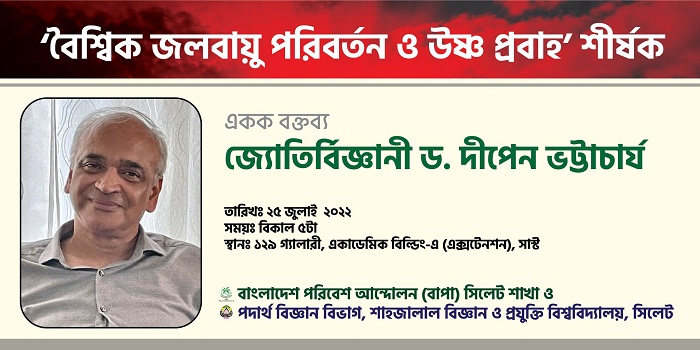 শাহজালাল বিজ্ঞান ও প্রযুক্তি বিশ্ববিদ্যালয়ে সোমবার বিশিষ্ট জ্যোতির্বিজ্ঞানী ডঃ দীপেন ভট্টাচার্য "বৈশ্বিক জলবায়ু পরিবর্তন ও উষ্ণ প্রবাহ" বিষয়ে একক বক্তব্য প্রদান করবেন।