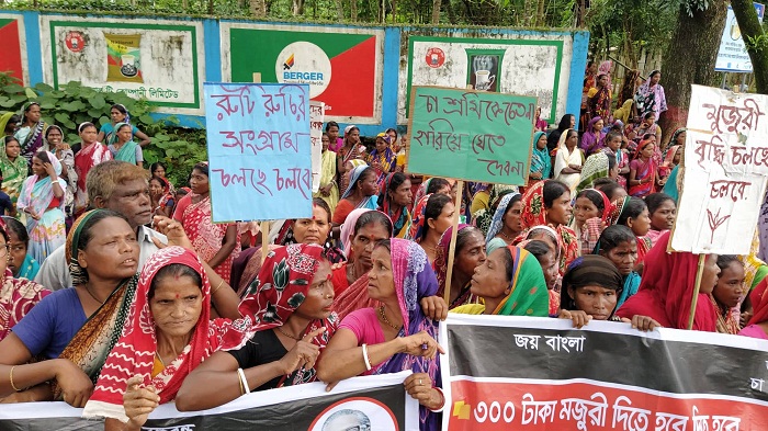 দৈনিক মজুরি ১২০ টাকা থেকে বাড়িয়ে ৩০০ টাকা করার দাবিতে সারাদেশের ১৬৭ বাগানে ধর্মঘট পালন করছেন চা শ্রমিকরা। শনিবার সকাল থেকে অনির্দিষ্টকালের এ ধর্মঘট শুরু হয়।ধর্মঘট পালনকালে শনিবার বিভিন্ন বাগানে বিক্ষোভও করেন শ্রমিকরা। নগরের বিমানবন্দর সড়কের লাক্তাতুরা চা বাগানের সামনে বিক্ষোভকালে আলাপ হয় রবি গোয়ালা ও রতন বাউরির সাথে।