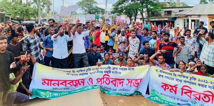 তিনশ টাকা মজুরীর দাবীতে বাংলাদেশ চা শ্রমিক ইউনিয়ন, কেন্দ্রীয় ঘোষিত ৫ দিনের কর্মবিরতী শেষে শনিবার দুপুরে মৌলভীবাজারের জুড়ীতে মানববন্ধন, আলোচনা সভা, বিক্ষোভ মিছিল ও সড়ক অবরোধ করেছে চা শ্রমিকবৃন্দ।