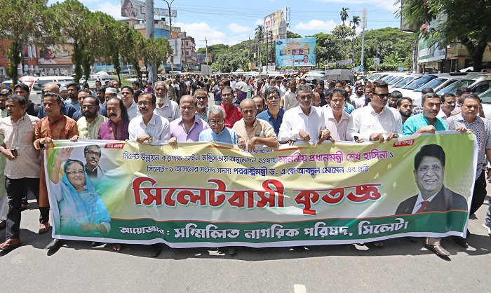 বুধবার দুপুরে নগরের কবি নজরুল অডিটোরিয়ামের সামনে থেকে ‘সম্মিলিত নাগরিক পরিষদ, সিলেট’র উদ্যোগে এই কৃতজ্ঞতা র্যালি বের করা হয়। র্যালিটি বিভিন্ন সড়ক প্রদক্ষিণ করে সিলেট কেন্দ্রিয় শহিদমিনারে এসে শেষ হয়। পরে সেখানে সমাবেশ অনুষ্ঠিত হয়।