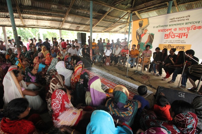 সভাপতির বক্তব্যে উজ্জ্বল মেহদী বলেন, একটি শ্রমিক আন্দোলনেল ব্যাপ্তি যখন রাজপথ রেলপথ অবরোধে গড়ায় তখন সে আন্দোলন শুধু দুই পক্ষের থাকে না। আপনাকেও পক্ষ বেছে নিয়ে প্রতিক্রিয়া ব্যক্ত করতে হয়। সাধারণ খেটে খাওয়া শ্রমিক-মজুর সহজে আন্দোলনে নামে না। পিঠ দেওয়ালে ঠেকলেই প্রান্তিক মানুষেরা বিশেষ করে নারী-শিশুরা দিনের পর দিন আন্দোলন করে। বিগত ১৯ দিন ধরে সিলেটের চা বাগান সমুহে শ্রমিকেরা কর্ম বিরতির মাধ্যমে নিজেদের মজুরি বৃদ্ধির আন্দোলন শুরু করেছে। বাগান মালিকদের উপেক্ষা ও আলোচনার টেবিলের টালবাহানা সেই আন্দোলনকে রাজপথে নিয়ে এসেছে। জাতীয় মহাসড়ক ও রেলপথ অবরোধের মধ্য দিয়ে আন্দোলন এখন নো রিটার্ণে পৌছেছে। এ অবস্থায় চা শ্রমিকদের আন্দোলন শুধুমাত্র চা শ্রমিকের আন্দোলন নয়। এ আন্দোলন মেহনতি মানুষের পিঠ দেয়ালে ঠেকে যাওয়ার আন্দোলন। ইতোমধ্যে আন্দোলনের যৌক্তিকতা সর্বমহলে আলোড়ন তুলেছে। তাই তৃতীয় পক্ষ হয়ে এই আন্দোলনে আমরা শ্রমিকদের প্রতি সংহতি ও সহমর্মিতা প্রকাশ করছি।