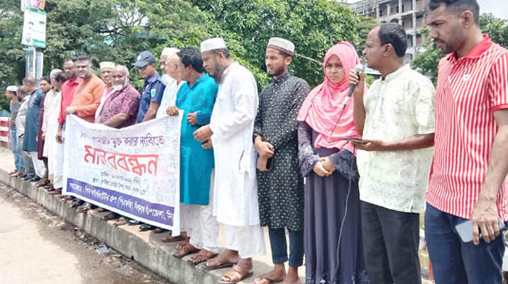 রোববার (২৮ আগস্ট) দুপুরে বাসিয়া ব্রিজের উপর এ মানববন্ধন কর্মসূচি পালন করে পিস ফ্যাসিলিটেটর গ্রুপ ‘পিএফজি’।
