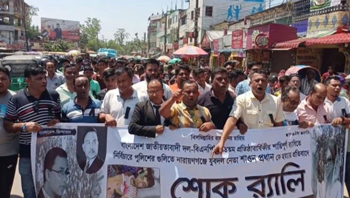 নারায়ণগঞ্জে যুবদল নেতা শাওনকে গুলিতে হত্যার প্রতিবাদে সুনামগঞ্জে শোক র্যালি হয়েছে।