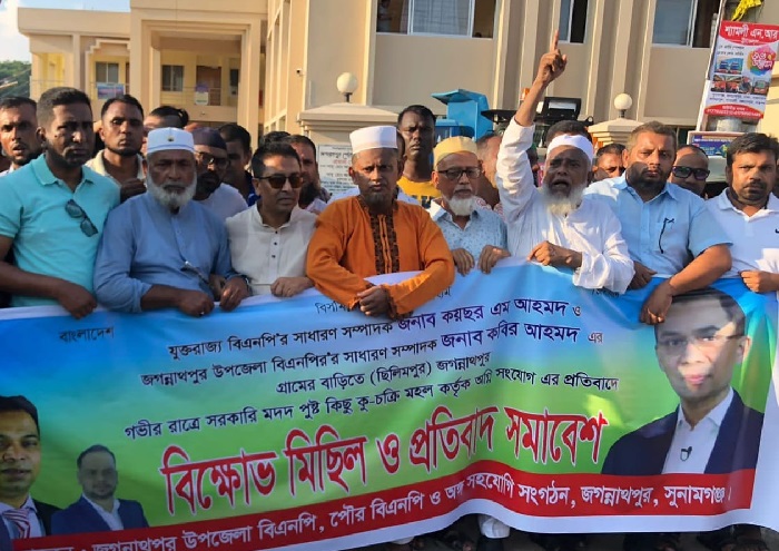 সুনামগঞ্জের জগন্নাথপুরে যুক্তরাজ্য বিএনপির সাধারণ সম্পাদক কয়ছর এম আহমদ ও তাঁর ভাই উপজেলা বিএনপির সাধারণ সম্পাদক কবির আহমদের গ্রামের বাড়িতে গভীর রাতে অগ্নি সংযোগে প্রতিবাদে বিক্ষোভ মিছিল ও প্রতিবাদ সমাবেশ অনুষ্ঠিত হয়েছে।