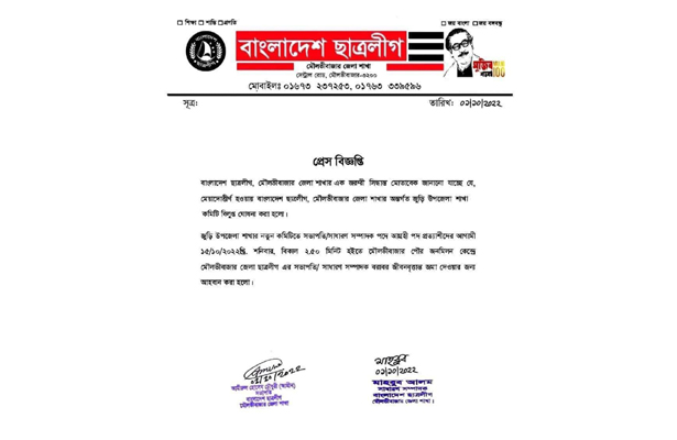 লিখিত প্যাডে উল্লেখ করা হয়, জেলা ছাত্রলীগের এক জরুরী সিদ্ধান্ত মোতাবেক জেলা শাখার আওতাধীন জুড়ী উপজেলা ছাত্রলীগের কমিটি মেয়াদোর্ত্তীণ হওয়ায় বিলুপ্ত ঘোষণা করা হল। জুড়ী উপজেলা শাখার সভাপতি-সম্পাদক পদপ্রত্যাশীদের আগামী ১৫ অক্টোবর জীবনবৃত্তান্ত দেওয়ার জন্য আহ্বান করা হলো।