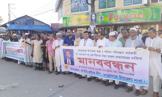 সুনামগঞ্জের জগন্নাথপুরে ‘গরীবের ডাক্তার’ খ্যাত উপজেলা স্বাস্থ্য ও পরিবার পরিকল্পনা কর্মকর্তা ডা. মধু সুধন ধরের বিরুদ্ধে মিথ্যা মামলা প্রত্যাহারের দাবিতে মানববন্ধন অনুষ্ঠিত হয়েছে।