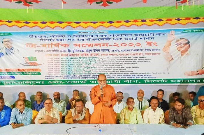 সিলেট মহানগর আওয়ামী লীগের সভাপতি বীর মুক্তিযোদ্ধা মাসুক উদ্দিন আহমদ বলেছেন, মহানগর আওয়ামী লীগের ওয়ার্ড সম্মেলনের ধারাবাহিকতায় ৬ নং ওয়ার্ড আওয়ামী লীগের সম্মেলন অনুষ্ঠিত হচ্ছে। তিনি পুরনো ইতিহাস টেনে বলেন, ৫১ বছর আগে আমরা স্বাধীনতা পেয়েছি। ৩০ লাখ শহীদ ও ২ লাখ মা-বোনের ইজ্জতের বিনিময়ে স্বাধীনতা অর্জন করেছি। মাননীয় প্রধানমন্ত্রী জননেত্রী শেখ হাসিনার নেতৃত্বে সাড়ে তের বছরে দেশ আজ উন্নয়নশীল রাষ্ট্রে পরিণত হয়েছে। শিক্ষা, স্বাস্থ্য, যোগাযোগ সহ সকল ক্ষেত্রে উন্নয়ন হয়েছে। সারা দেশে ৫৬০ টি মডেল মসজিদ তৈরি করা হচ্ছে। শুধু মসজিদ নয় মন্দিরও করা হচ্ছে। এভাবেই উন্নয়ন চলমান রয়েছে। কিন্তু অগ্রযাত্রাকে রুখে দিতে বিএনপি জামায়াত ষড়যন্ত্র করছে। এই স্বাধীনতা বিরোধী চক্রদের দেশে থাকার অধিকার নাই। তাদেরকে পাকিস্তান প্রেম পেয়েছে। কথায় কথায় পাকিস্তান পাকিস্তান বলে। কিন্তু জননেত্রীর নেতৃত্বে ইতিমধ্যে আমরা পাকিস্তানকে ছাড়িয়ে গেছি। আর তারা পাকিস্তান প্রেমে মজে ষড়যন্ত্র অব্যাহত রেখেছে। সকল ষড়যন্ত্র মোকাবেলা করে দেশকে এগিয়ে নিতে এবং বঙ্গবন্ধুর সোনার বাংলা প্রতিষ্ঠায় আওয়ামী লীগের কোনো বিকল্প নাই। সে জন্য ঐক্যবদ্ধ হয়ে কাজ করতে হবে। ওয়ার্ডকে সুসংগঠিত করার মাধ্যমে এগিয়ে যেতে হবে। তাহলেই বঙ্গবন্ধুর স্বপ্নের সোনার বাংলা প্রতিষ্ঠিত হবে।