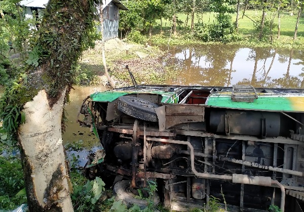 স্থানীয় ও পুলিশ সূত্রে জানা যায়, সিলেট থেকে দিরাইমুখী শুভযাত্রা পরিবহণ নামের একটি যাত্রীবাহী বাস (চট্ট-মেট্রো জ- ১১-০৫৪৮) দামোধরতপী এলাকার নোয়াগাঁও গ্রামে স্থানীয় মেম্বার মো. আনোয়ার হোসেনের বাড়ির সামনে এলে নিয়ন্ত্রণ হারিয়ে খাদে পড়ে যায়। এতে ঘটনাস্থলেই টিপু মিয়া ও রুপা বেগমের মৃত্যু হয়৷ এসময় আরো ৪ থেকে ৫জন গুরুতর আহত হয়েছেন। প্রথমে স্থানীয়রা ও পরে পুলিশ ও ফায়ার সার্ভিসের লোকজন হতাহতদের উদ্ধার করেন। আহতদের সুনামগঞ্জ সদর ও সিলেট হাসপাতালে পাঠানো হয়েছে।