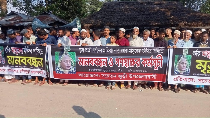 চাচাতো বোনকে ধর্ষণের দায়ে অভিযুক্ত ব্যক্তির শাস্তির দাবিতে মানববন্ধন করেছে এলাকাবাসী।