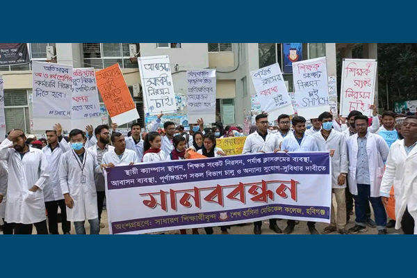 শিক্ষক সংকট নিরসন ও স্থায়ী ক্যাম্পাসসহ ১২ দফা দাবিতে মানববন্ধন এবং ক্লাস বর্জন করেছেন হবিগঞ্জ শেখ হাসিনা মেডিকেল কলেজের শিক্ষার্থীরা। রোববার (২৩ অক্টোবর) সকালে কলেজের সামনে শিক্ষার্থীরা মানববন্ধনে অংশ নেন। এর আগে সমস্যা সমাধানে প্রয়োজনীয় ব্যবস্থা নিতে অধ্যক্ষের কাছে স্মারকলিপি জমা দেন তারা।