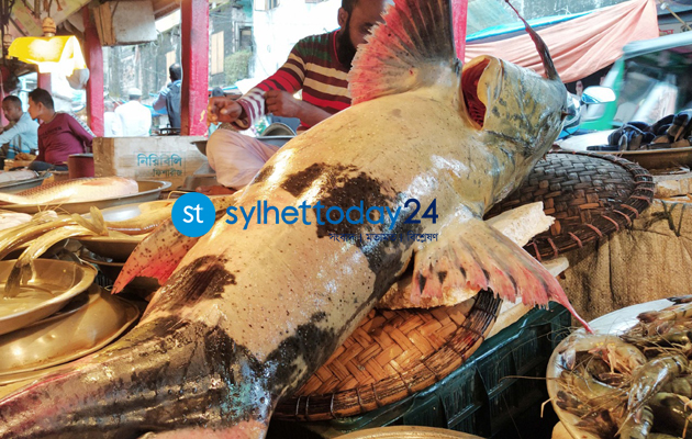 সিলেট নগরীর বন্দরবাজারে অন্যতম মাছের বাজার লালবাজারে দেখা গেল বিশাল আকৃতির একটি বাঘাইড় মাছ।