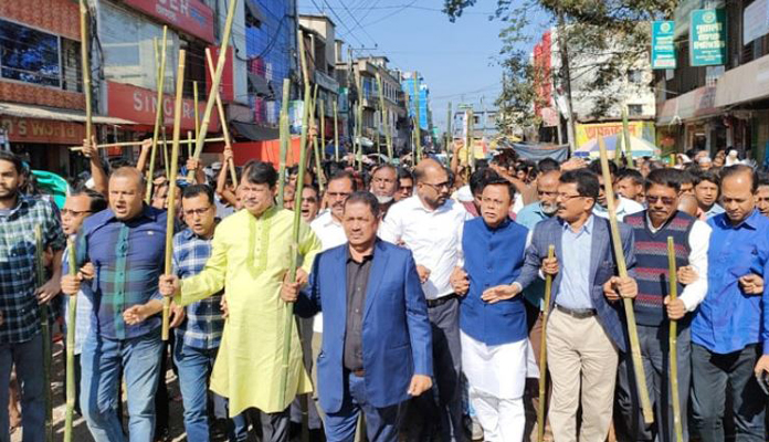 দুপুরে শহরের রমিজ বিপণির দলীয় কার্যালয় থেকে জেলা পরিষদ চেয়ারম্যান নুরুল হুদা মুকুটের নেতৃত্বে লাঠি মিছিল বের হয়।