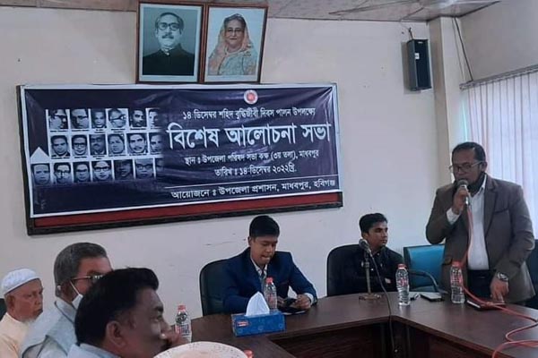 হবিগঞ্জের মাধবপুরে উপজেলা প্রশাসনের আয়োজনে শহীদ বুদ্ধিজীবী দিবস উপলক্ষে আলোচনা সভা অনুষ্ঠিত হয়েছে।