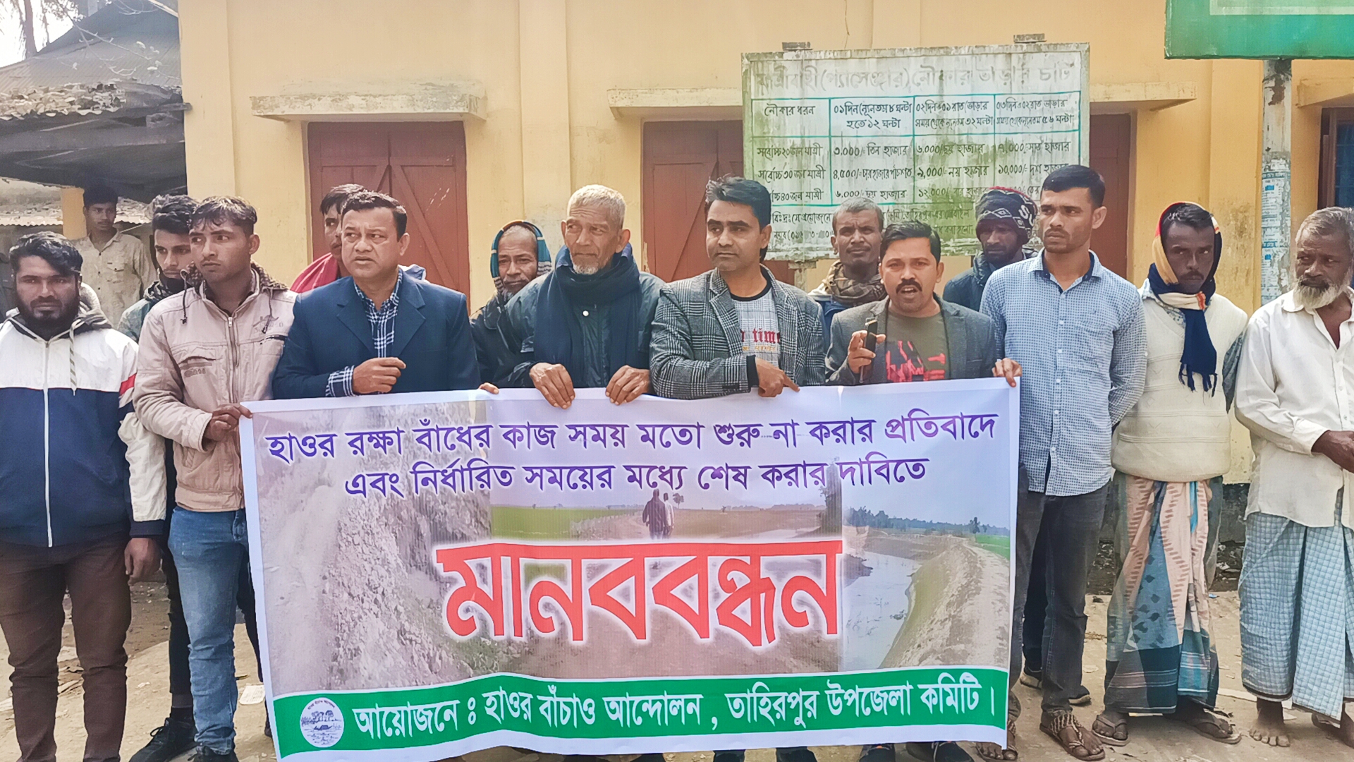 হাওর রক্ষাবাঁধ নির্মাণে সময় ক্ষেপণ করায় ও দ্রুত বাঁধের কাজ শুরু করে শেষ করার দাবীতে সুনামগঞ্জের তাহিরপুর উপজেলার হাওর বাঁচাও আন্দোলন মানববন্ধন কর্মসূচি পালন করেছে।