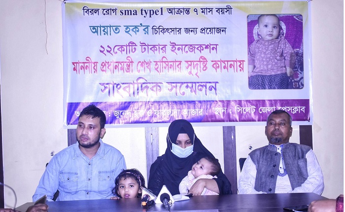 সংবাদ সম্মেলনে সিলেট নগরের মেজরটিলা ইসলামপুর ব্লক সি-এর ৭৯ নং বাসার বাসিন্দা মোহাম্মদ জুনেদ হক ও ফারজানা আক্তার দম্পতি জানান, তাদের ৮ মাস বয়সী মেয়ে আয়াত হক ‘স্পাইনাল মাস্কুলার অ্যাট্রফি (এসএমএ) নামক বিরল রোগ আক্রান্ত। জন্মের কিছুদিন পরই তারা লক্ষ্য করেন, তাদের মেয়ের হাত-পা অস্বাভাবিক নরম এবং সেগুলো নাড়াতে পারছে না। ঘাড় শক্ত না থাকায় সেটিও সোজা করতে পারছে না। পাশাপাশি শ্বাস নিতেও তার কষ্ট হয়। আয়াতের মা-বাবা জানান, প্রথমে তারা সিলেটের কয়েকজন শিশু বিশেষজ্ঞের কাছে মেয়েকে নিয়ে যান। পরে তাদের পরামর্শে ঢাকার ধানমন্ডি এলাকার ‘মেডেস্ক’ নামক বেসরকারি হাসপাতালের ডা. মিজানুর রহমানের শরণাপন্ন হন।
