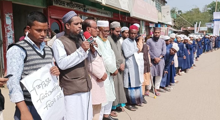 বুধবার দুপুর ১২টায় মাদ্রাসার সম্মুখে মীরগঞ্জ বাজারে এ মানববন্ধন অনুষ্ঠিত হয়।