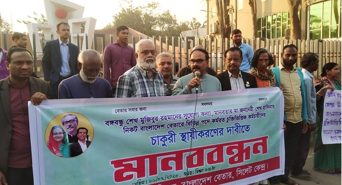 চাকরি স্থায়ী করার দাবিতে বাংলাদেশ বেতার সিলেট কেন্দ্রের চুক্তিভিত্তিক শিল্পী, কলাকুশলী ও কর্মচারীরা মানববন্ধন করেছেন।