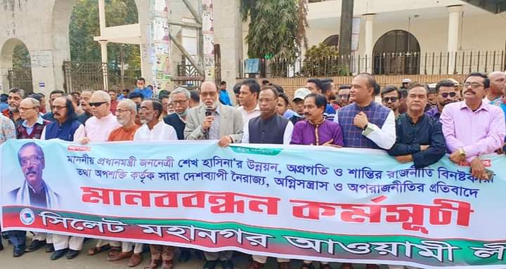 শনিবার (১৮ ফেব্রুয়ারি) বিকাল ৩ ঘটিকায় বন্দরবাজারস্থ কোর্ট পয়েন্টে বাংলাদেশ আওয়ামী লীগের কেন্দ্রীয় কর্মসূচীর অংশ হিসেবে সিলেট মহানগর আওয়ামী লীগের উদ্যোগে মাননীয় প্রধানমন্ত্রী জননেত্রী শেখ হাসিনা'র উন্নয়ন, অগ্রগতি ও শান্তির রাজনীতি বিনষ্টকারী তথা অপশক্তি কর্তৃক সারা দেশব্যাপী নৈরাজ্য, অগ্নিসন্ত্রাস ও অপরাজনীতির প্রতিবাদে মানববন্ধন কর্মসূচীতে তিনি এসব কথা বলেন।