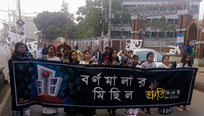 বর্ণমালা হাতে বর্ণমালার মিছিলে বারবার উচ্চারিত হয়েছে সেই সব শহিদের আত্মদানের কথা যাদের আত্মত্যাগের ফলে আমরা বাংলায় মা কে ‘মা’ বলে বলতে পারছি।