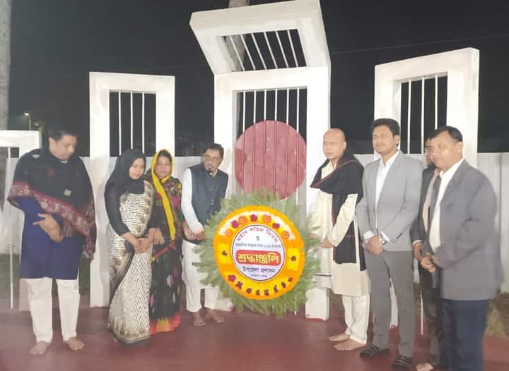 মঙ্গলবার (২১ ফেব্রুয়ারি) রাত ১২টা ১ মিনিটে একুশের প্রথম প্রহরে উপজেলা কেন্দ্রীয় শহীদ মিনারে শ্রদ্ধা নিবেদন করেন উপজেলা প্রশাসন, উপজেলা পরিষদ, মুক্তিযোদ্ধা সংসদ ও থানা পুলিশ।