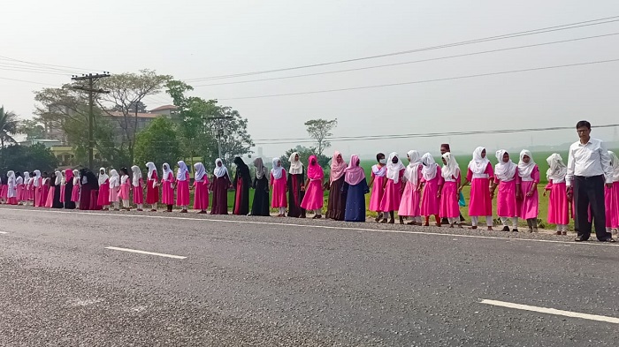 মঙ্গলবার (২৮ ফেব্রুয়ারি) দুপুরে বিদ্যালয় কৃর্তপক্ষ ও এলাকাবাসীর উদ্যাগে বিদ্যালয়ের সামনে ঢাকা-সিলেট মহাসড়কে ঘণ্টাব্যাপী মানববন্ধন অনুষ্ঠিত হয়।