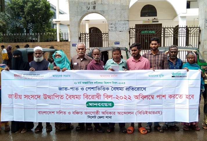 ২১ মার্চ আন্তর্জাতিক বর্ণবৈষম্য বিলোপ দিবস উপলক্ষে কেন্দ্রীয় কর্মসূচির অংশ হিসেবে সিলেট জেলা দলিত ও বঞ্চিত জনগোষ্ঠী অধিকার আন্দোলনের (বিডিইআরএম) উদ্যোগে মঙ্গলবার সকাল ১০টায় নগরীর কোর্ট পয়েন্টে মানববন্ধন অনুষ্ঠিত হয়েছে।