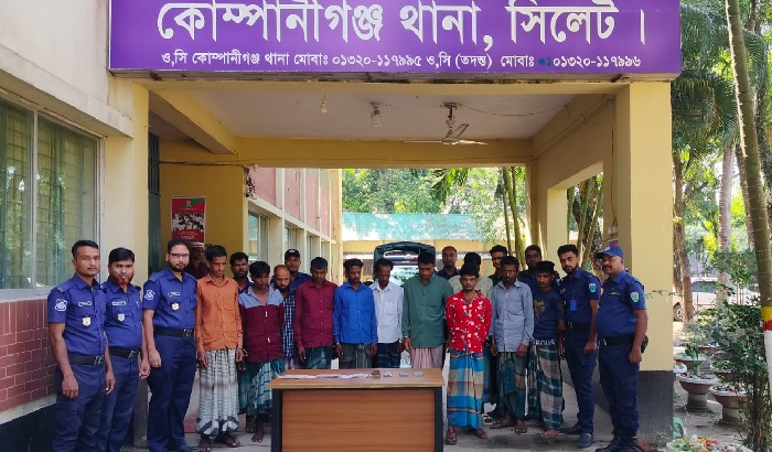 গ্রেপ্তারকৃতরা হলেন- উপজেলার কায়েতগাঁও গ্রামের ফকির মিয়া (৪০), রইছ মিয়া (৪৫), ইজ্জত উল্লাহ (২০), আবুল কাশেম (৩৭), কমর উদ্দিন (৩৮), দৌলত উর রহমান (৩৫), খাগাইল গ্রামের শাদুল্লাহ (৩০), ইসলাম উদ্দিন (৪০), মহিষখেড় গ্রামের মুহিবুর রহমান (৫০), রাজাপুর গ্রামের মানিক মিয়া (৪০), দরাকুল গ্রামের মঈন উদ্দিন (৪০) ও ভোলাগঞ্জ গ্রামের শাহানুর হোসেন (৩৬)।