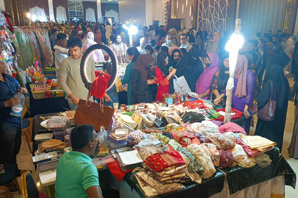 শুক্রবার রাত ৯টায় সিলেট নগরীর মার্কেট ও শপিংমলগুলোতে খুব একটা ভিড় নেই। কিন্তু নগরীর একটি কনভেনশন হলে পা ফেলার জায়গা নেই। কনভেনশন হলের সামনে থেকে শুরু করে পুরো হলের দুই ফ্লোরে প্রচুর নারীদের সমাগম। কেউ শাড়ি কিনছেন, কেউ সালোয়ার কামিজ, কেউবা কিনছেন জুয়েলারি। ক্রেতা বিক্রেতাদের সমাগম দেখলে যে কেউ বলবে এটি কোনো মার্কেট ও শপিংমলের ভিতর। কিন্তু এটি কোনো মার্কেট ও শপিংমলের ভিতর না। এটি একটি নারী উদ্যোক্তা মেলা।
