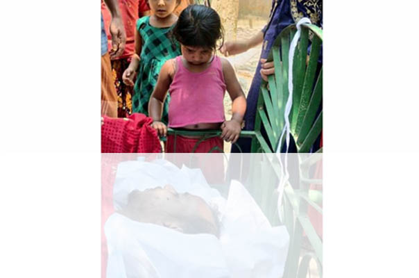 বাড়ির উঠানে বাবার লাশ। অবুঝ শিশু মিমের (৩) চিৎকার বাবা কেন ঘুম থেকে উঠছে না। অনেক ডাকাডাকি-টানাটানির পরেও বাবা যখন ঘুম থেকে উঠছেন না তখন অবুঝ শিশু বাবার মাথার পাশে খাটিয়ায় হাত দিয়ে অভিমান করে দাঁড়িয়ে আছে।