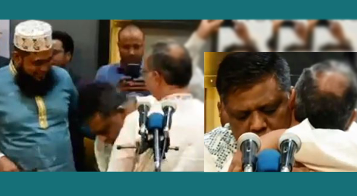 আসাদ উদ্দিনের পা ছুঁয়ে সালাম করছেন আনোয়ারুজ্জামান (বামে)। এরপর তাকে বুকে জড়িয়ে ধরেন আসাদ উদ্দিন (ডানে)।