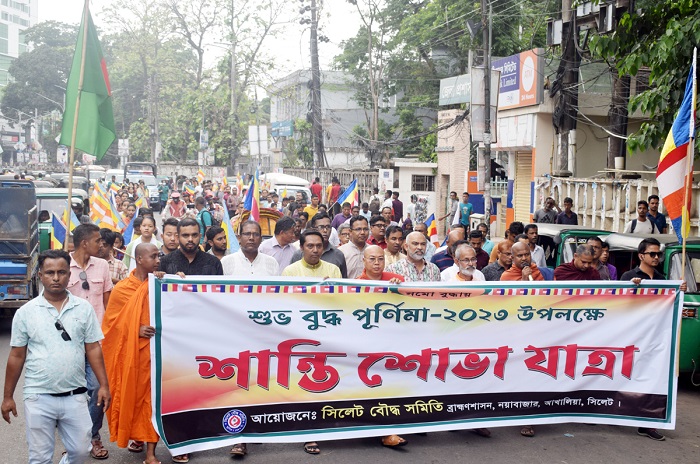 শুভ বুদ্ধ পূর্ণিমা-২০২৩ উপলক্ষে সিলেট নগরীতে শান্তি শোভাযাত্রা বের করা হয়েছে। বৃহস্পতিবার (৪ মে) বিকেলে সিলেট বৌদ্ধ সমিতির উদ্যোগে এই শান্তি শোভাযাত্রা বের করা হয়।