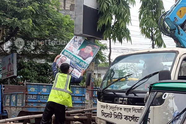 সিলেট সিটি করপোরেশন নির্বাচন উপলক্ষে প্রার্থীদের পক্ষে নগরের বিভিন্ন এলাকায় শুভেচ্ছা ও দোয়া চেয়ে নির্মাণ করা তোরণ, টানানো ব্যানার, ফেস্টুন ও পোস্টার অপসারনে নেমেছে সিলেট আঞ্চলিক নির্বাচন অফিস। শনিবার (৬ মে) সকাল ১১টার দিকে সিলেট মেন্দিবাগস্থ নির্বাচন অফিস থেকে ৪টি টিম শহরের বিভিন্নস্থানে এ অভিযান শুরু করে।