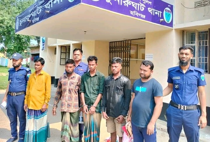 চুনারুঘাট থানার ওসি মোঃ রাশেদুল হক এক বিজ্ঞপ্তিতে সাংবাদিকদের জানিয়েছেন, গ্রেপ্তার উপজেলার কাছিশাইল গ্রামের মৃত আঃ গণীর পুত্র আবু ছায়েদ (২৯), পৌরসভার বাল্লা ক্রসরোড এলাকার মোঃ ছমদ মিয়ার পুত্র মোঃ শিপন মিয়া (২৮),ইকরতলী গ্রামের তাজুল মিয়ার পুত্র সোহাগ মিয়া (২২), শ্রীরামপুর গ্রামের মোঃ রুমন আলীর পুত্র মোঃ সুজন মিয়া(৩০), কালামন্ডল গ্রামের মোঃ আঃ কাদিরের পুত্র মোঃ মোঃ আঃ মালেক রাব্বী(৩২)।