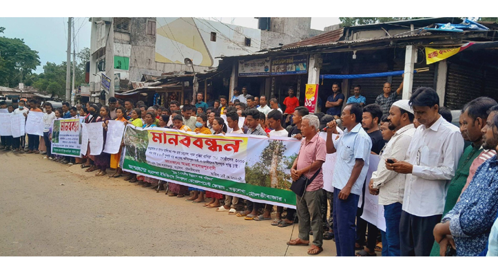 রোববার (১৪ মে) দুপুর আড়াইটায় উপজেলার উত্তর শাহবাজপুর বাজারের বীর মুক্তিযোদ্ধা চত্বর এলাকায় এ মানববন্ধন হয়। এতে বেরেঙ্গা খাসিয়াপুঞ্জির বাসিন্দাসহ ক্ষতিগ্রস্ত পরিবারের দুই শতাধিক নারী-পুরুষ অংশ নেন।