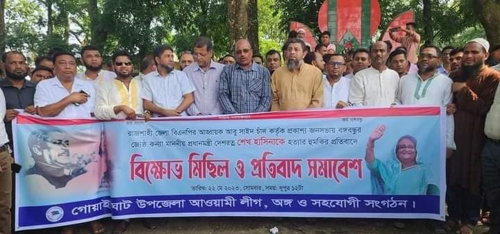 রাজশাহীতে বিএনপির সমাবেশ থেকে প্রধানমন্ত্রী শেখ হাসিনাকে বিএনপিনেতা আবু সাইদ চাঁদ কর্তৃক ‘হত্যার হুমকি’ দেওয়ার প্রতিবাদে মিছিল ও সমাবেশ করেছে গোয়াইনঘাট উপজেলা আওয়ামীলীগ ও সহযোগী সংগঠন। এসময় তারা হুমকিদাতা বিএনপি নেতা চাঁদের দৃষ্টান্ত মুলুক শাস্তির দাবি জানান।