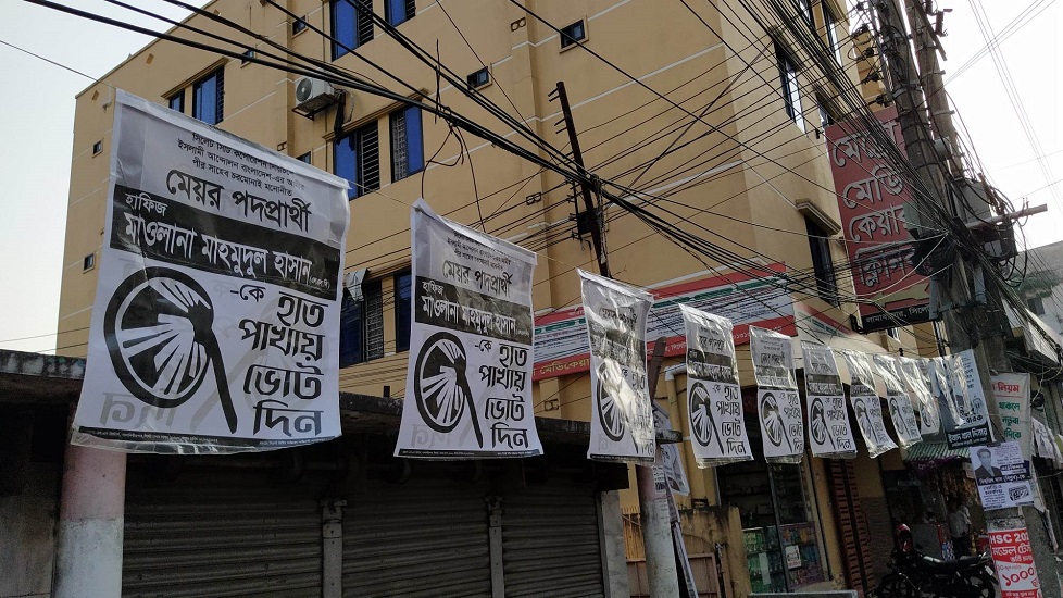 নগরের ১ নম্বর ওয়ার্ডে লেমিনেটিং করা পোস্টার টানিয়েছেন কাউন্সিলর প্রার্থী ও বর্তমান কাউন্সিলর তৌফিকুল হাদী।