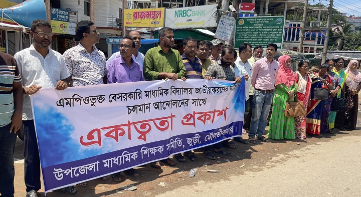 এমপিওভুক্ত বেসরকারি মাধ্যমিক বিদ্যালয় জাতীয়করণের দাবিতে চলমান আন্দোলনের সাথে একাত্মতা প্রকাশ করে মৌলভীবাজারের জুড়ীতে মানববন্ধন করেছে উপজেলা মাধ্যমিক শিক্ষক সমিতি।