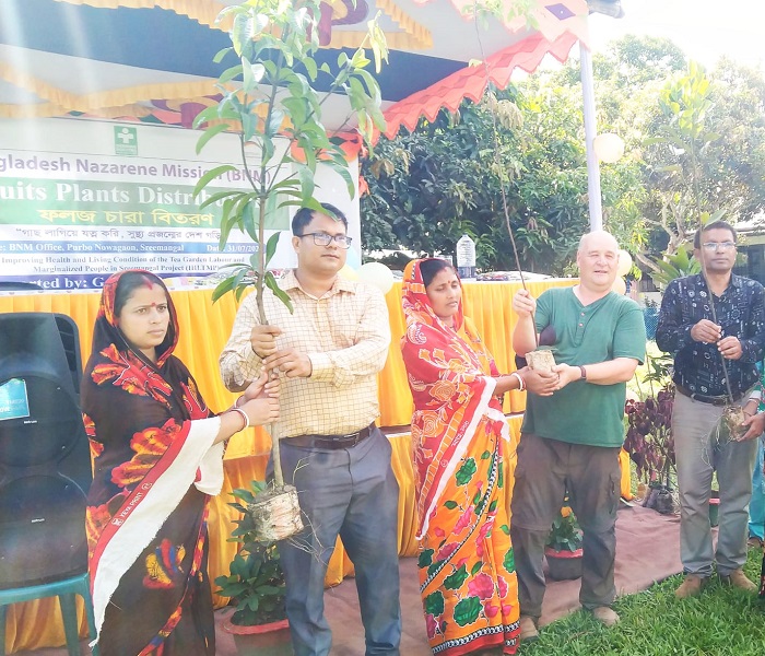 উল্লেখ্য, ‘বাংলাদেশ ন্যাজ্যারীন মিশন আয়োজিত (আইএইচএলটিএমপি) প্রকল্পের ৬শ জন উপকারভোগীদের স্বাস্থ্য সেবা ও জীবনমান উন্নয়নের লক্ষ্যে প্রকল্পের আওতায় কালিঘাট, রাজঘাট, আশিদ্রোণ ও শ্রীমঙ্গল সদর ইউনিয়নের উপকারভোগীদের মাঝে ১টি আম, ১টি কাঠাল ও ১টি কামরাঙা চারা জনপ্রতি ৩টি করে ৬শ জনকে ১৮শ পিস ফলদ বৃক্ষ দেওয়া হয়।’