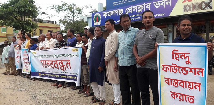 বৃহস্পতিবার (১৪ সেপ্টেম্বর) বিকাল ৪টায় ভানুগাছ বাজারস্থ কমলগঞ্জ প্রেসক্লাব প্রাঙ্গণে ধর্মীয় সংখ্যালঘু সুরক্ষা আইন, দেবোত্তার বোর্ড ও হিন্দু ফাউন্ডেশন বাস্তাবায়নের দাবিতে এই মানববন্ধন অনুষ্ঠিত হয়।