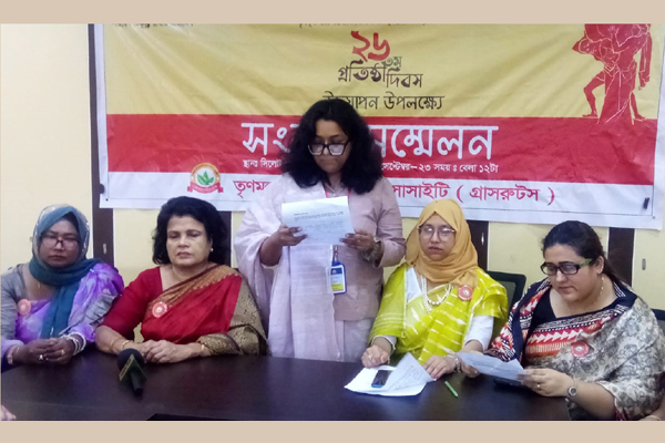২৬তম প্রতিষ্ঠা বার্ষিকী উপলক্ষে তৃণমূল নারী উদ্যোক্তা সোসাইটি গ্রাসরুটস বুধবার (২৭ সেপ্টেম্বর) সিলেট জেলা প্রেসক্লাবে আয়োজিত সংবাদ সম্মেলনে লিখিত বক্তব্যে একথা বলেন সংগঠনের সাধারণ সম্পাদক ডা. নাফিসা শবনম।