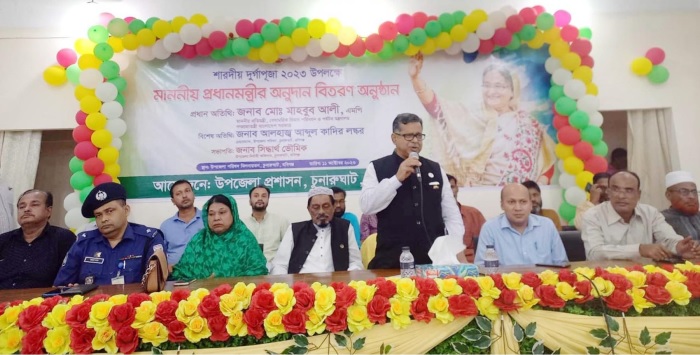 পরে অতিথিবৃন্দ চুনারুঘাট উপজেলার ৮৫টি পূজা মণ্ডপের সভাপতি ও সম্পাদকের হাতে প্রধানমন্ত্রীর উপহার হিসেবে ১৫ লক্ষ টাকা অনুদান বিতরণ করেন।