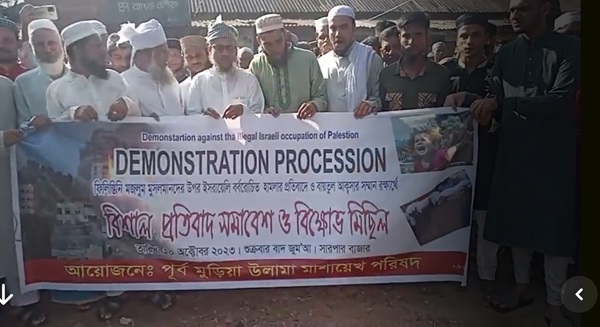 পূ্র্ব মুড়িয়া উলামা মাশায়েখ পরিষদের ব্যানারে হাজারো বিক্ষোভকারীরা ইসরায়েলি বাহিনীর আগ্রাসন, হামলা ও নির্বিচারে নারী-শিশুকে হত্যার বিচার দাবি করে বিভিন্ন স্লোগান দেন, এবং তীব্র নিন্দা প্রকাশ করেন।