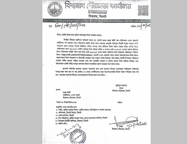 রোববার (২২ অক্টোবর) বিশ্বনাথ পৌরসভার ২০২৩/১৩৪১ নং স্মারকের মাধ্যমে পৌরসভার মেয়র মুহিবুর রহমান তাকে শোকজ করেন। এতে আগামী ৭ (সাত) কার্যদিবসের মধ্যে তাকে কারণ দর্শাতে বলা হয়েছে। অন্যথায় ওই কাউন্সিলরের বিরুদ্ধে একতরফাভাবে সিদ্ধান্ত গ্রহণ করা হবে বলেও নোটিসে উল্লেখ করা হয়েছে।