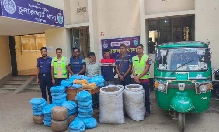 গ্রেপ্তারের বিষয়টি নিশ্চিত করে চুনারুঘাট থানার (ওসি) মো. রাশেদুল হক সাংবাদিকদের জানিয়েছেন, সবুজ রঙের একটি সিএনজি অটোরিকশায় ছয়টি সাদা রঙের চা পাতার বস্তায় করে ৭৫ কেজি গাঁজা পাচার করে উপজেলার সাতছড়ি এলাকায় নেয়ার পথে চুনারুঘাট থানার একদল পুলিশ চুনারুঘাট পৌরসভার হাতুন্ডা সাকিনস্থ ঢাকা-সিলেট পুরাতন সড়কের সরকারি কলেজের সামনে অভিযান পরিচালনা করে তাদেরকে গ্রেপ্তার করেছে।
