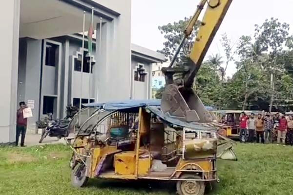 মঙ্গলবার (৭ নভেম্বর) বিকেলে হবিগঞ্জ পৌরসভার মাঠে পৌর কর্তৃপক্ষ ইজিবাইকগুলো এক্সকাভেটর দিয়ে গুঁড়িয়ে দেয়।